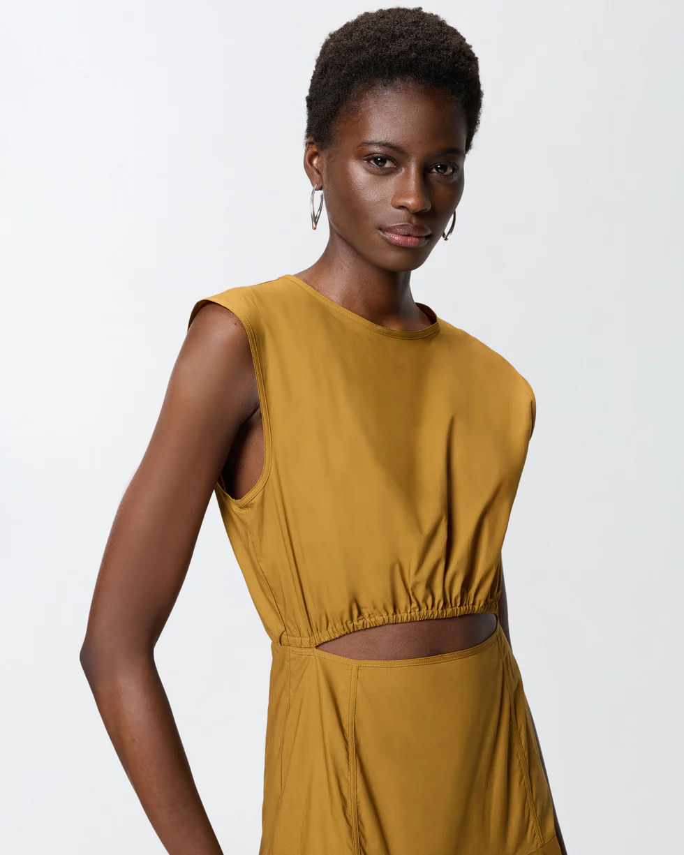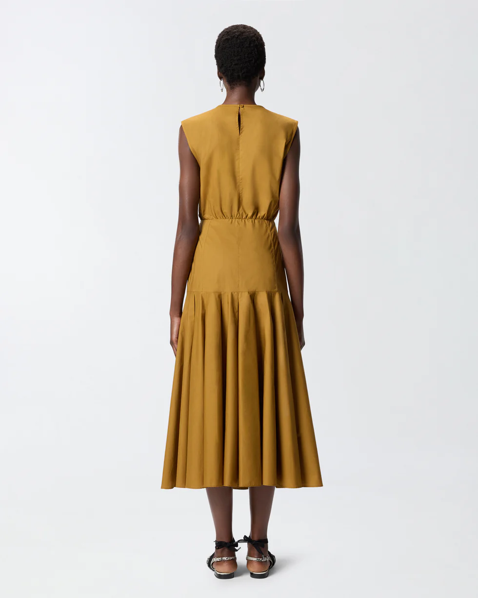 Vestido de largo midi sin mangas confeccionado en popelina de puro algodón fresca y agradable al tacto. La prenda se distingue por la falda ligeramente acampanada con pliegues suaves y por el cuerpo, caracterizado por un cuello redondo con botón y abertura en forma de lágrima en la espalda, y por una base elástica y fruncida que crea un pequeño detalle cut-out en la parte delantera. El modelo se completa con una cremallera oculta en el lateral para ponérselo fácilmente.