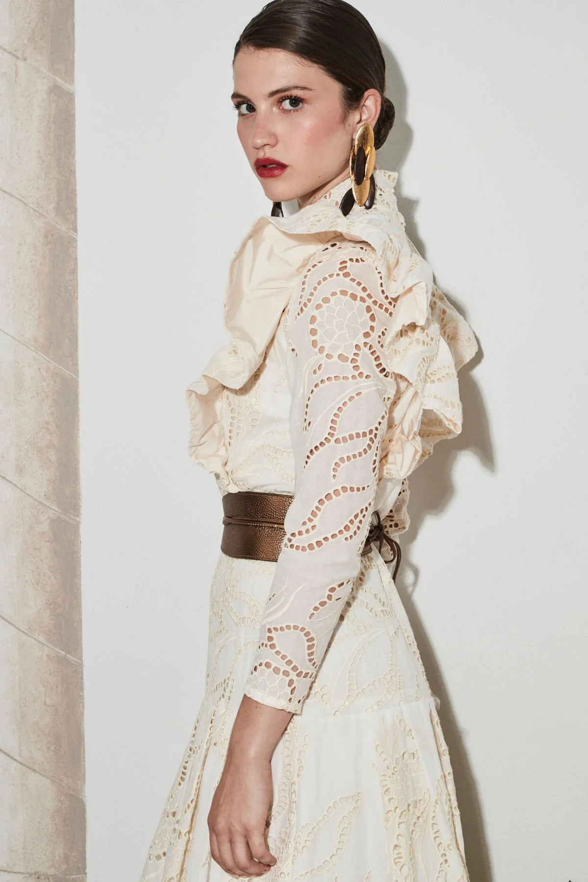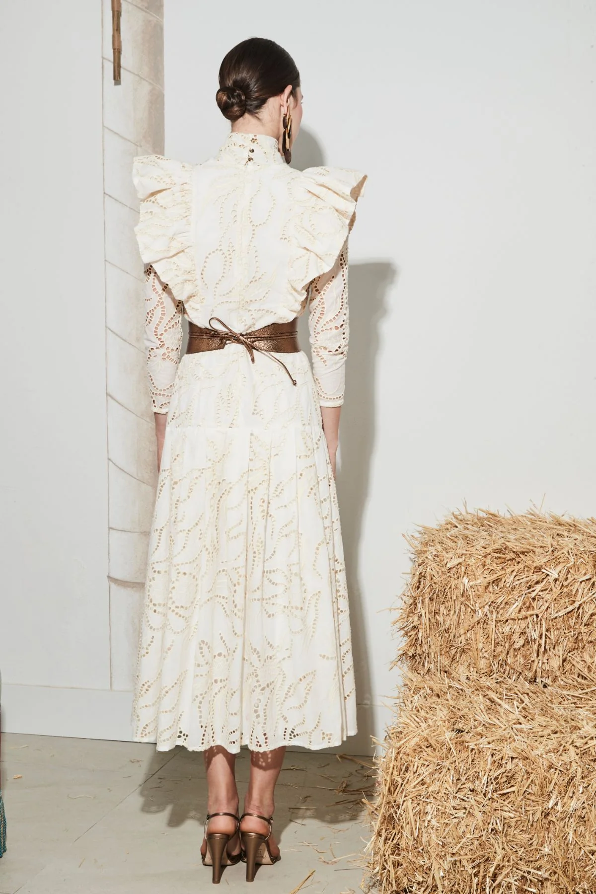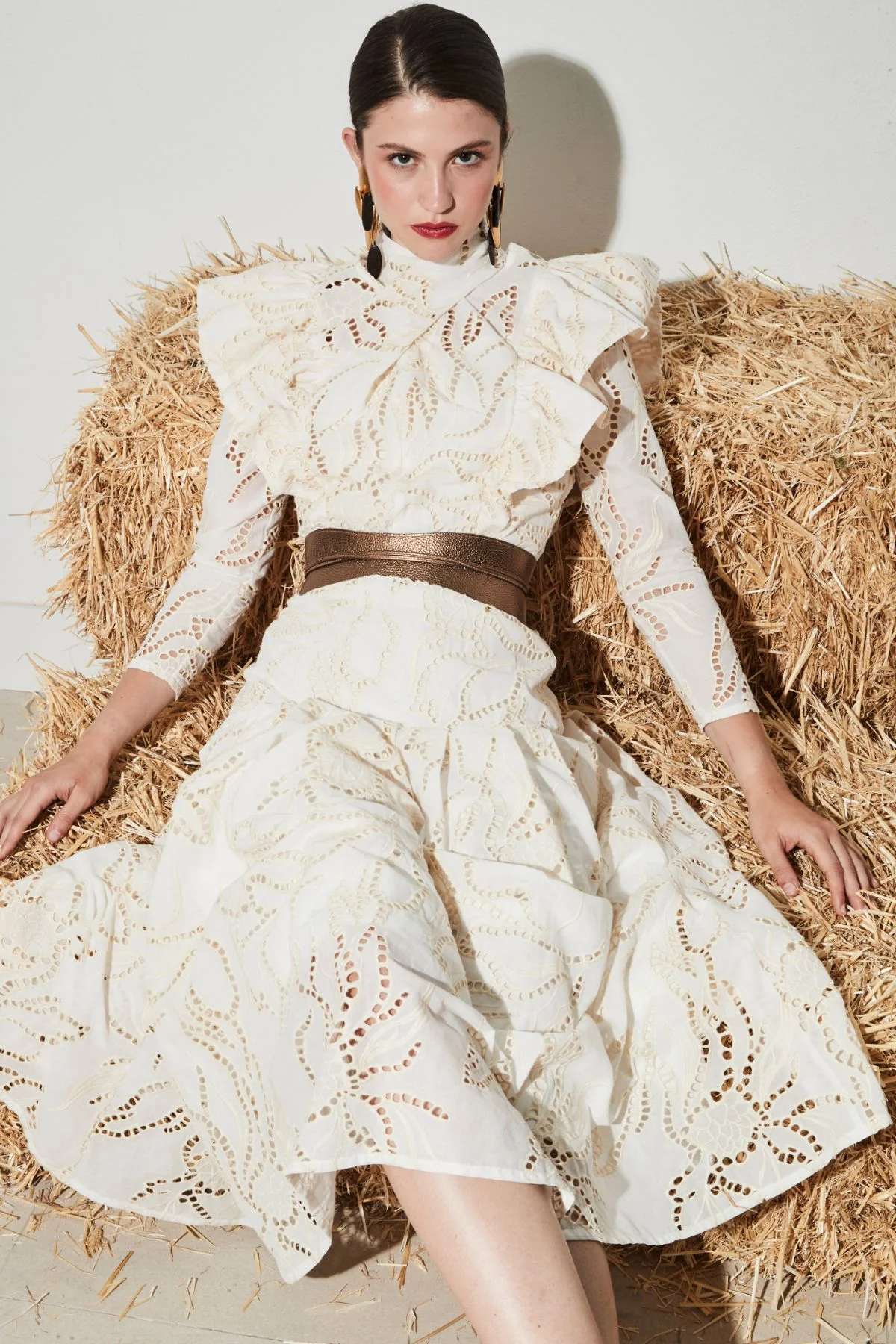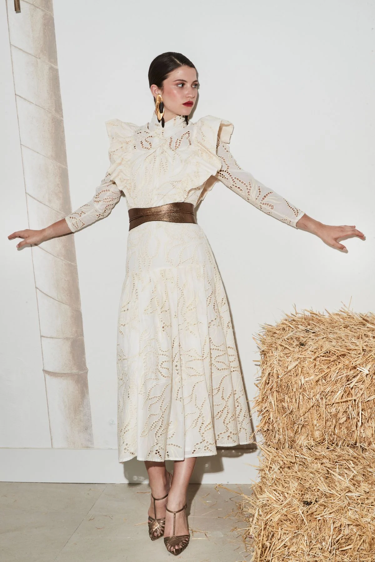 Este vestido de corte midi está confeccionado en tejido bordado calado, con un delicado diseño floral que aporta textura y sofisticación. Destaca por su cuello alto y volantes estructurados en hombros y pecho, que realzan la silueta con un aire femenino y elegante. Su falda de corte evasé y largo midi crea una caída fluida y favorecedora. Una pieza especial, ideal para ocasiones señaladas o looks de invitada con carácter.