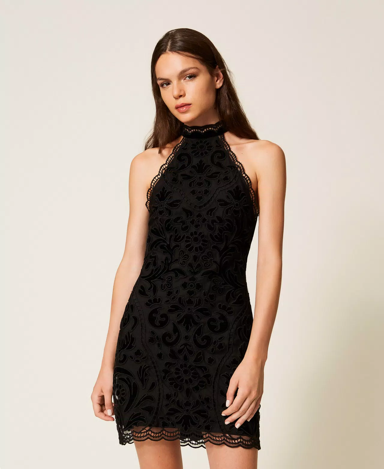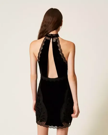 Vestido corto con base de tul bordado con motivos de terciopelo de estilo barroco. Presenta un escote halter con botones en la parte trasera del cuello, cierre con cremallera en el lateral, vivos festoneados, escote pronunciado en la parte trasera, forro, placa con logotipo Oval T en la parte trasera y corte ceñido.