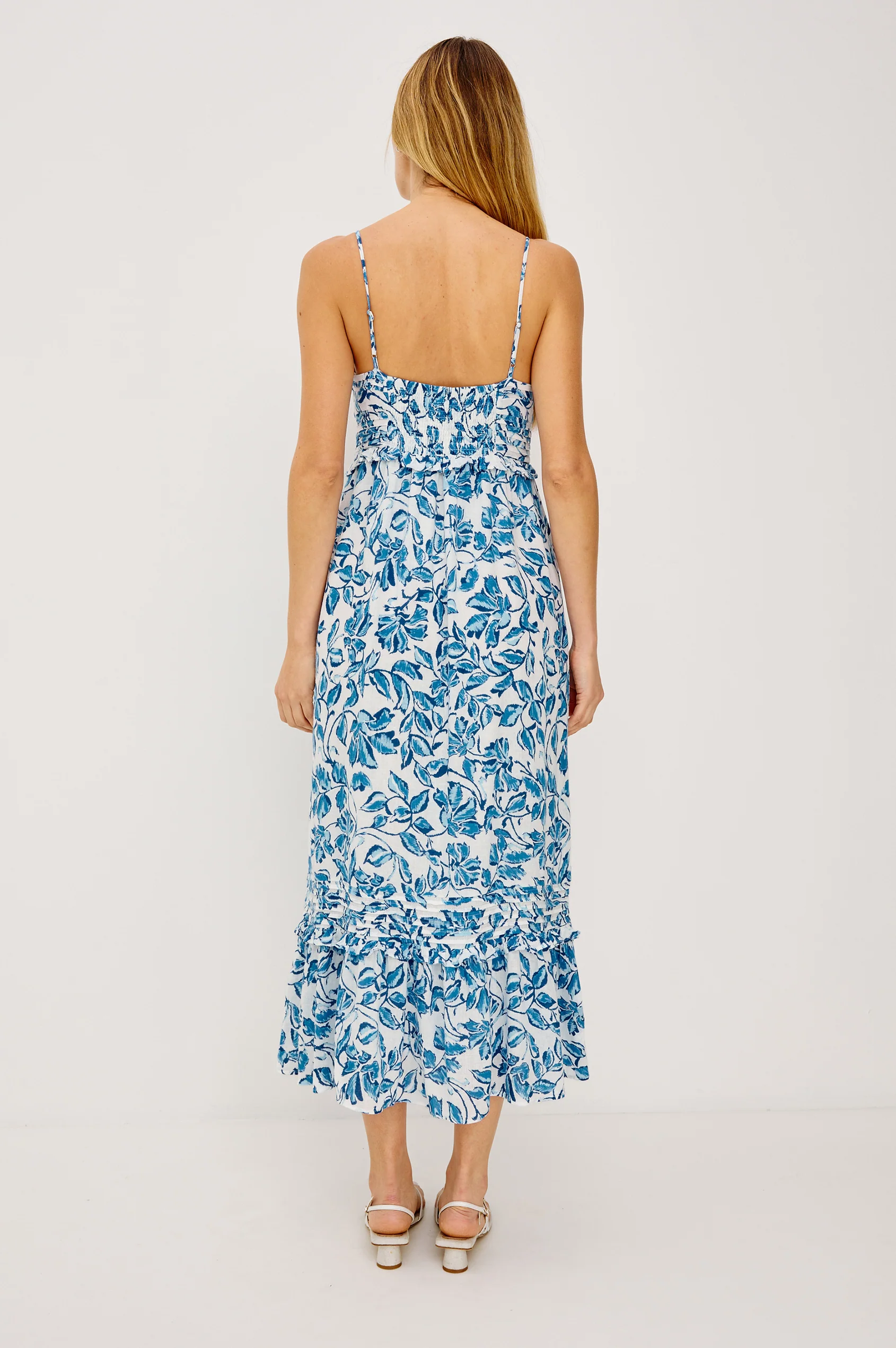 El vestido largo Wisteria es una prenda de lino de lujo con tirantes ajustables, escote en V, botones delanteros, detalles de costuras y volantes, un corte holgado y cómodo, y una falda completamente forrada con fruncido en la parte trasera para mayor comodidad.
